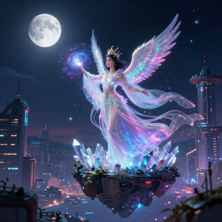 Digital fantasy artwork: Angelic woman with glowing wings and crown, floating on crystal-encrusted platform under full moon, futuristic cityscape background.