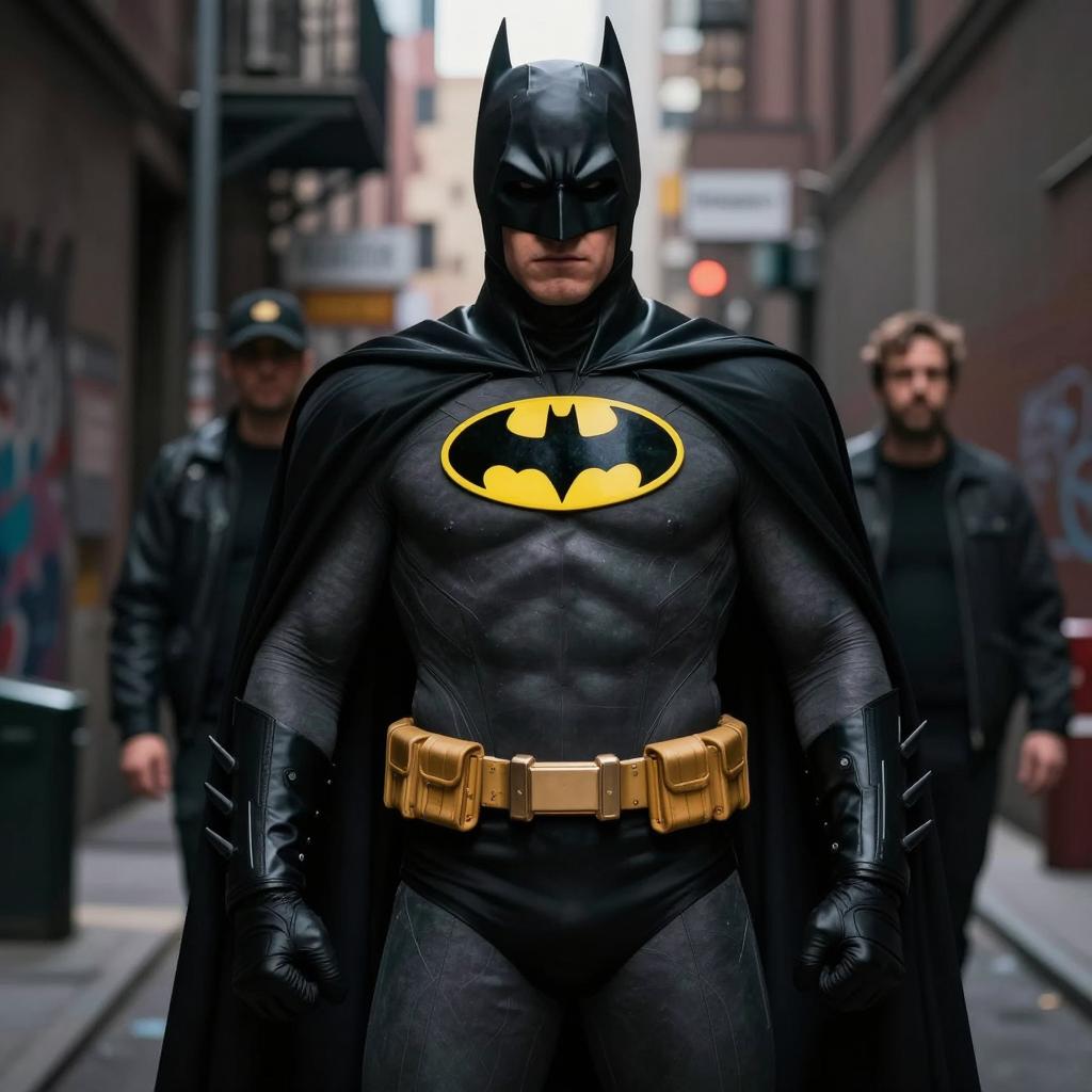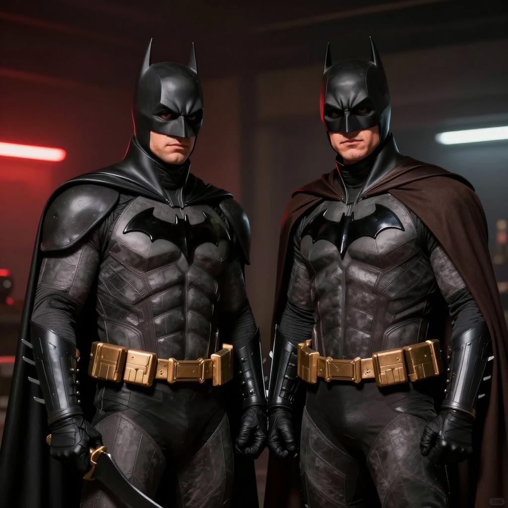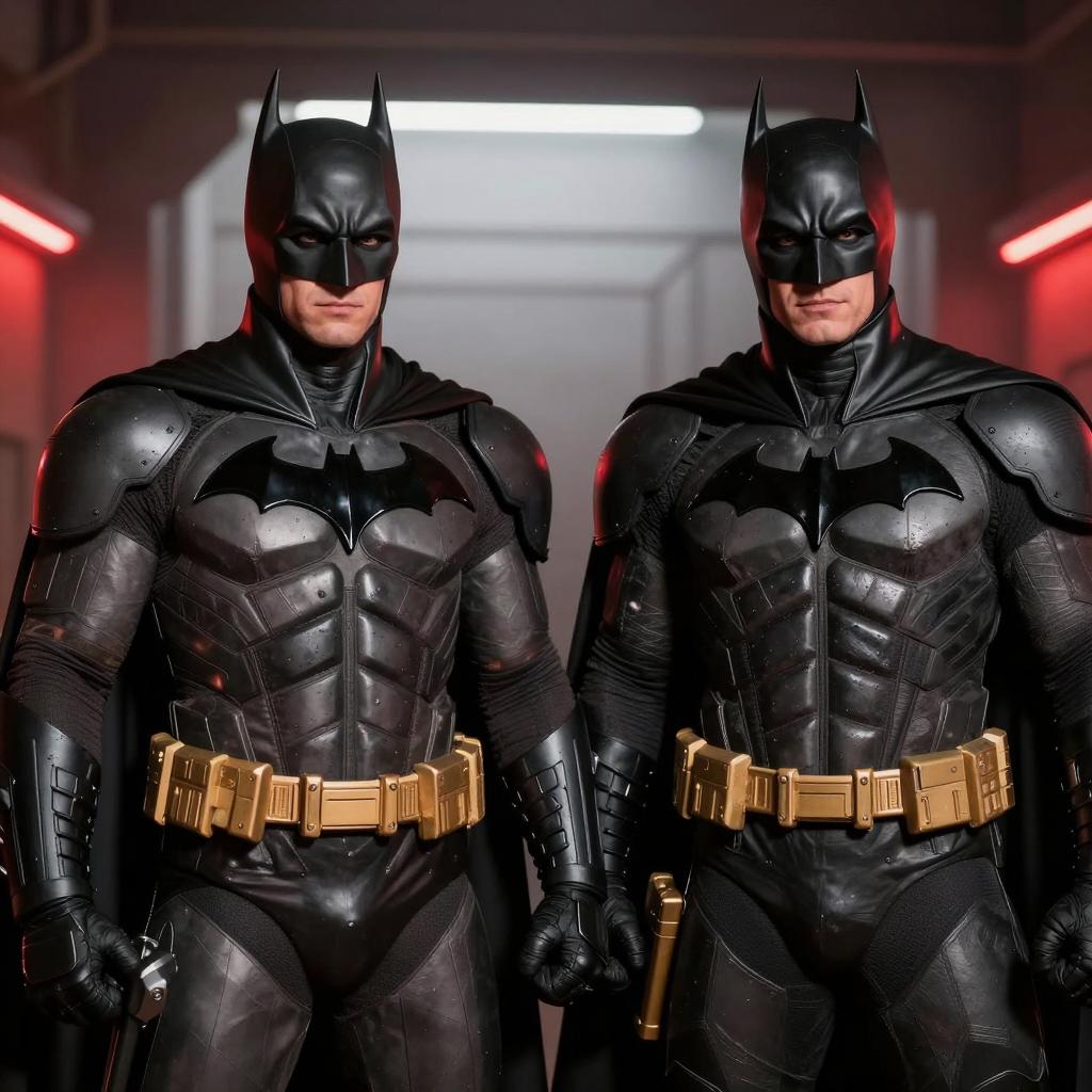 Two men wearing black armored Batman costumes with bat masks and muscular physiques stand side by side in a dimly lit corridor with red and white lighting. The man on the left is holding a bat-shaped weapon, while the man on the right wears a black cowl and utility belt. Both suits feature detailed armor plating and yellow utility belts.