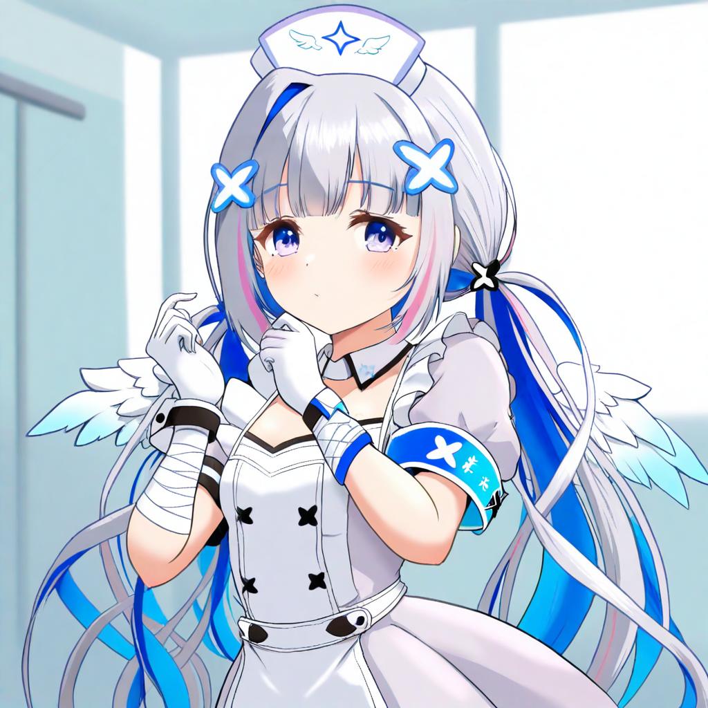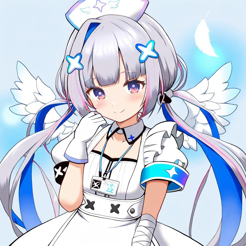 Amane kanata (nurse), hololive, 1girl, angel wings, angel wings, purple eyes, blue hair, grey hair, colored inner hair, single hair intake, official alternate hairstyle, streaked hair, official alternate hair length, long hair, pink hair, x hair ornament, twintails, blunt bangs, small breasts, flat chest, nurse cap, white gloves, white dress, white apron, detached collar, puffy short sleeves, virtual youtuber, virtual youtuber, feathered wings, feathered wings, nurse, nurse, bandaged arm, id card, armband, by artist tof, animagine