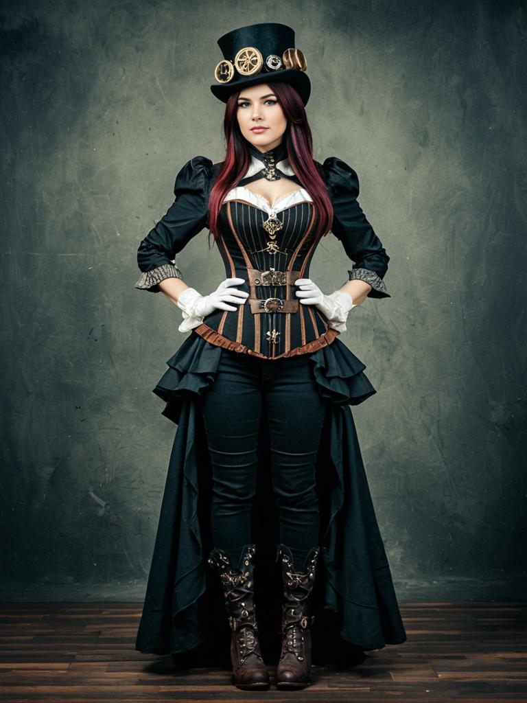 Woman in Steampunk Lady Costume, full-body cosplay photo with corset and hat