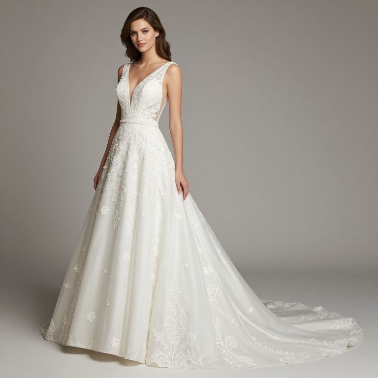 Photograph of a young woman with long brown hair, wearing a white, sleeveless, V-neck ball gown wedding dress with a fitted bodice and a full, flowing skirt adorned with delicate floral lace patterns. The dress has a long train that extends onto the floor. She stands against a plain gray background, looking slightly to her left with a neutral expression. The dress has a smooth satin texture with intricate lace detailing, highlighting a classic and elegant bridal style.