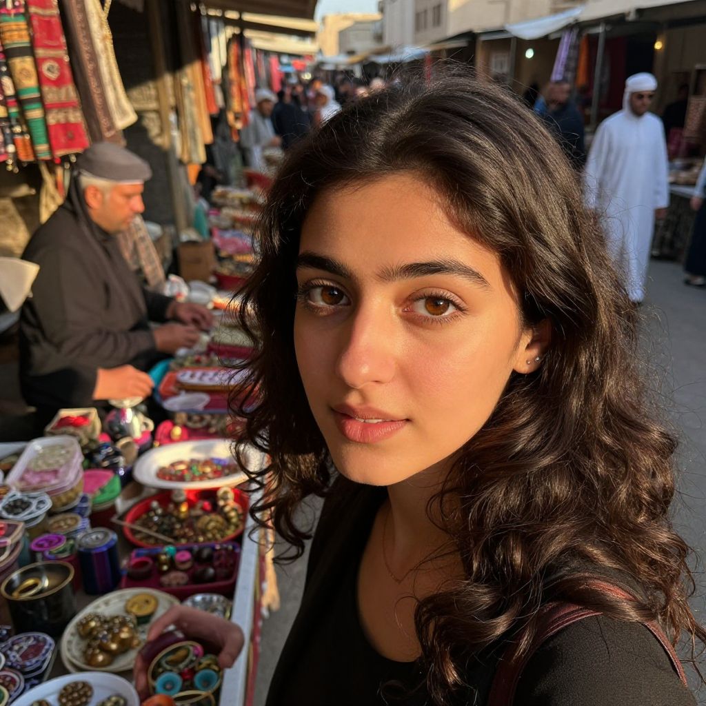 Visualize a hyperrealistic portrait of a young Middle Eastern woman with dark, wavy hair cascading over her shoulders, set against the vibrant backdrop of a bustling ancient marketplace. From an overhead perspective, focus on her deep, warm brown eyes, which emanate a sense of curiosity and warmth as she interacts with local vendors. The late afternoon sun bathes her radiant skin in a golden glow, accentuating the subtle nuances of her complexion and casting a playful dance of shadows across her features. This atmospheric scene evokes a spectrum of emotions, from lively engagement to a hint of nostalgia, drawing viewers into a world where ancient traditions coexist with the vibrancy and energy of modern life.