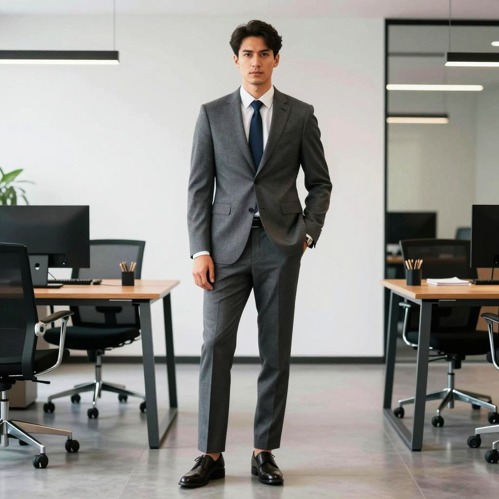 A confident young man stands in a modern office space wearing a stylish gray suit with a white shirt and blue tie. He has dark hair and is dressed in polished black dress shoes. The office features sleek contemporary furnishings including black office chairs, wooden desks, and computer monitors on a polished concrete floor.