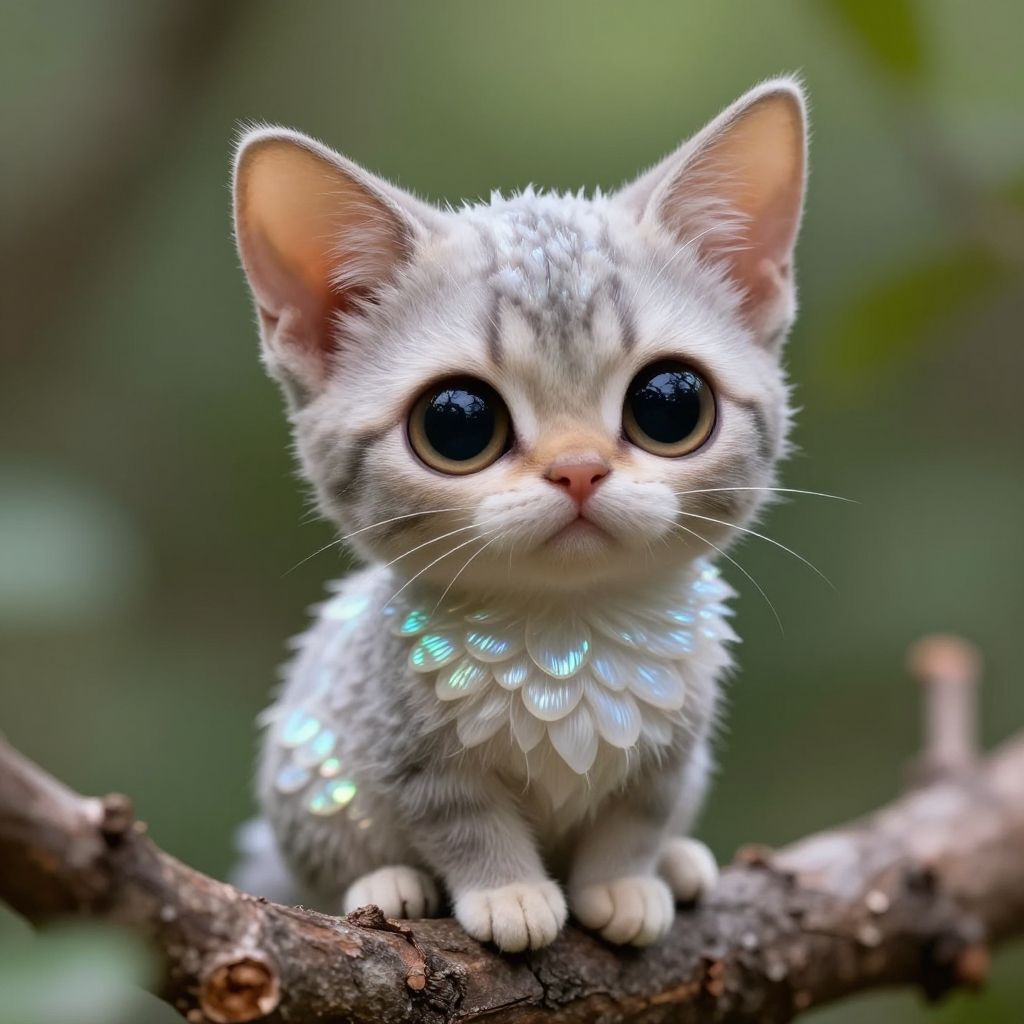 Hyper detailed, realistic, tiny adorable big eared feline creature sitting on a branch, big eyes, iridescent scales, adorable