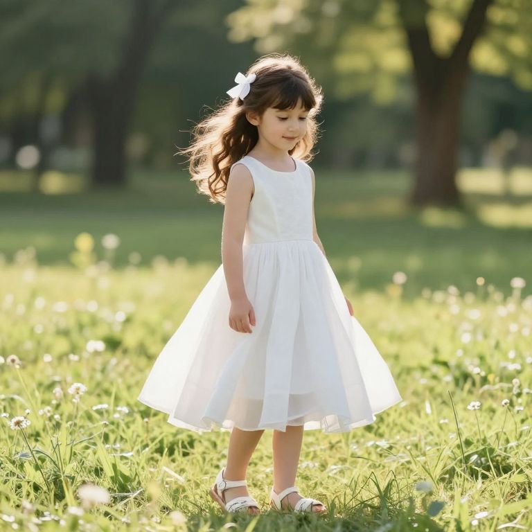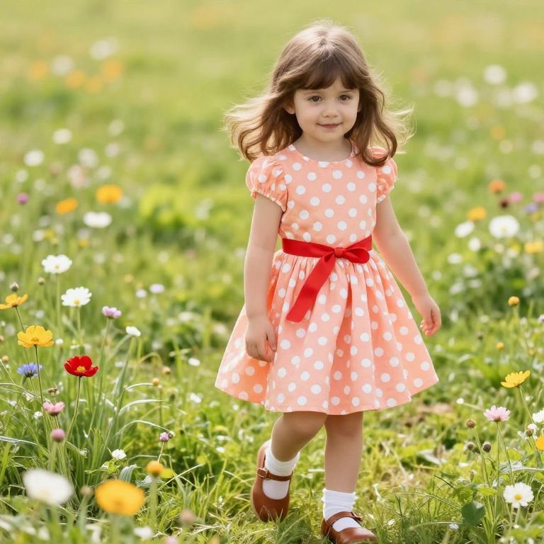 A young girl with soft brown hair, gently flowing in the breeze, wearing a stylish black and green dress with intricate floral patterns, a bright green headscarf tied neatly at the back, and a flowing green skirt that reaches just below her knees. She stands in a sunlit meadow, smiling warmly with her hands slightly raised, surrounded by blooming wildflowers and soft golden sunlight filtering through the trees. The scene is peaceful and vibrant, with a touch of whimsy and natural beauty.