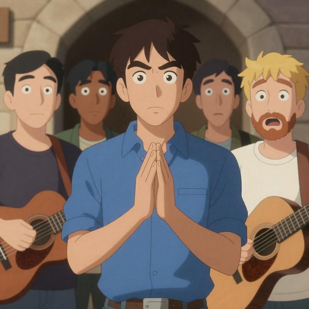 Digital animation of a group of men. Central figure, dark-haired man in blue shirt, hands clasped, intense expression. Blonde man with red beard, playing guitar, surprised expression. Background: stone wall, archway, other men with varied expressions.