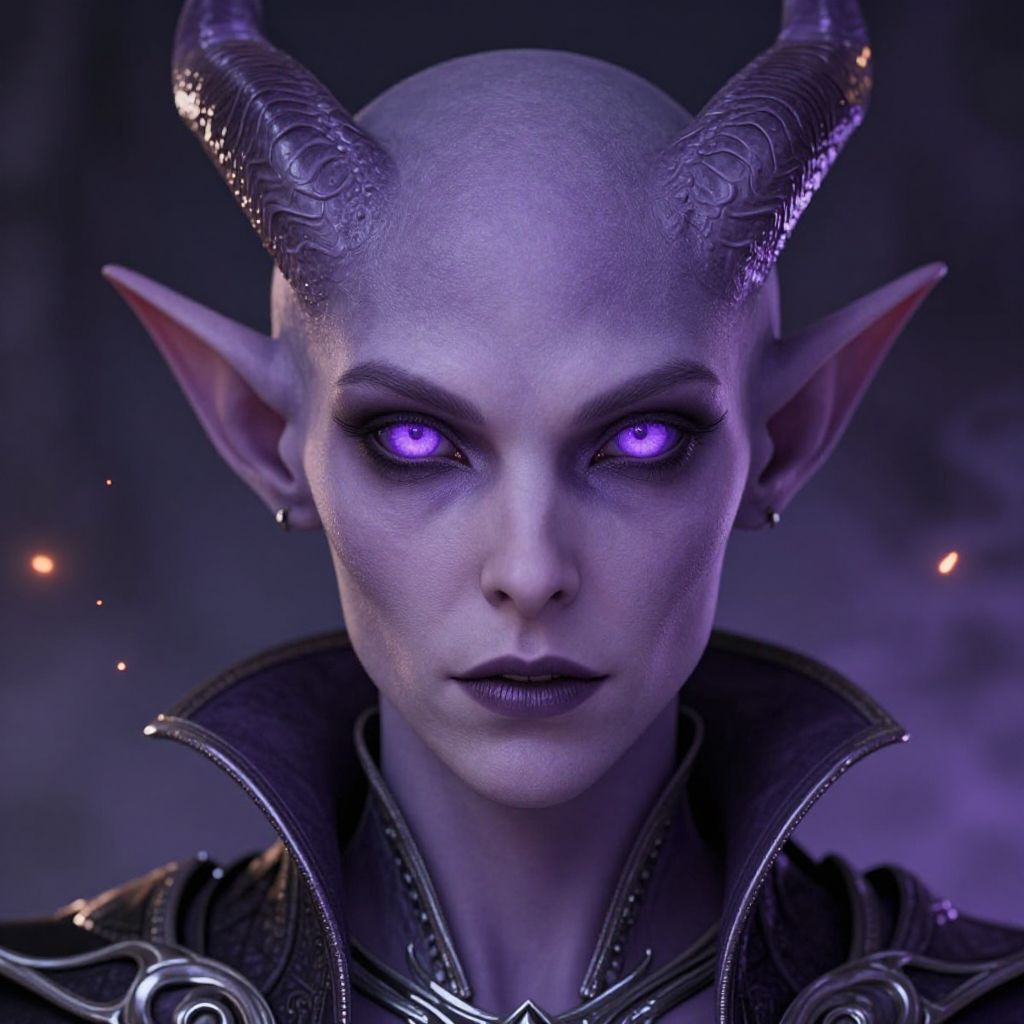 Close-up portrait of a purple tiefling with striking violet eyes and elegant horns, subtle smoky background with floating sparks of magic, dark gothic clothing with silver embellishments, fantasy character concept, cinematic lighting