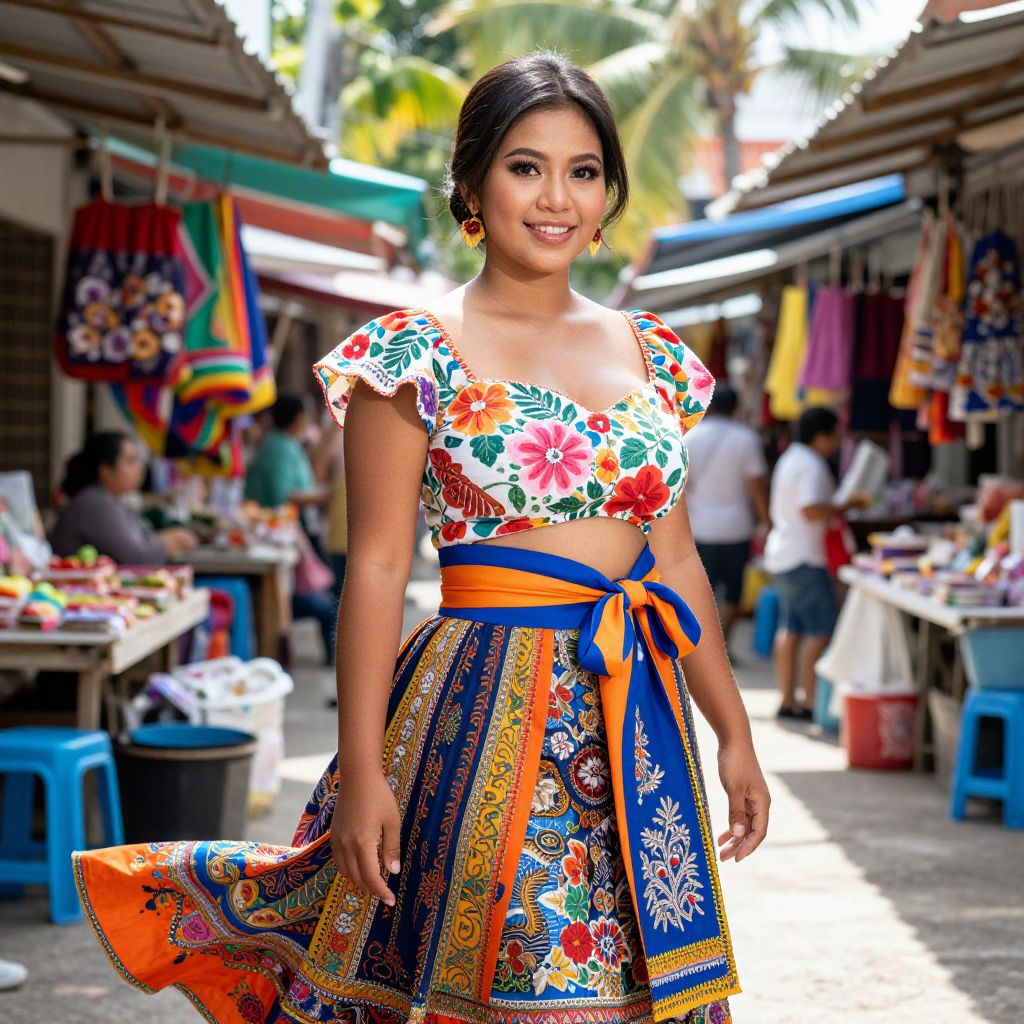 A vibrant and authentic modern filipiniana costume worn by a graceful Filipino woman with warm brown skin, full dark eyes, and a confident smile, standing in a sunny traditional marketplace in Cebu, with colorful fabrics flowing in the breeze, showcasing a floral-patterned blouse, wide sash, and a flowing skirt with intricate embroidery, set against a backdrop of bright street vendors and tropical foliage.. The woman has big tits and cute face