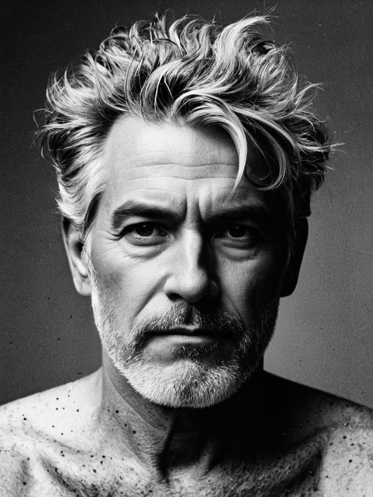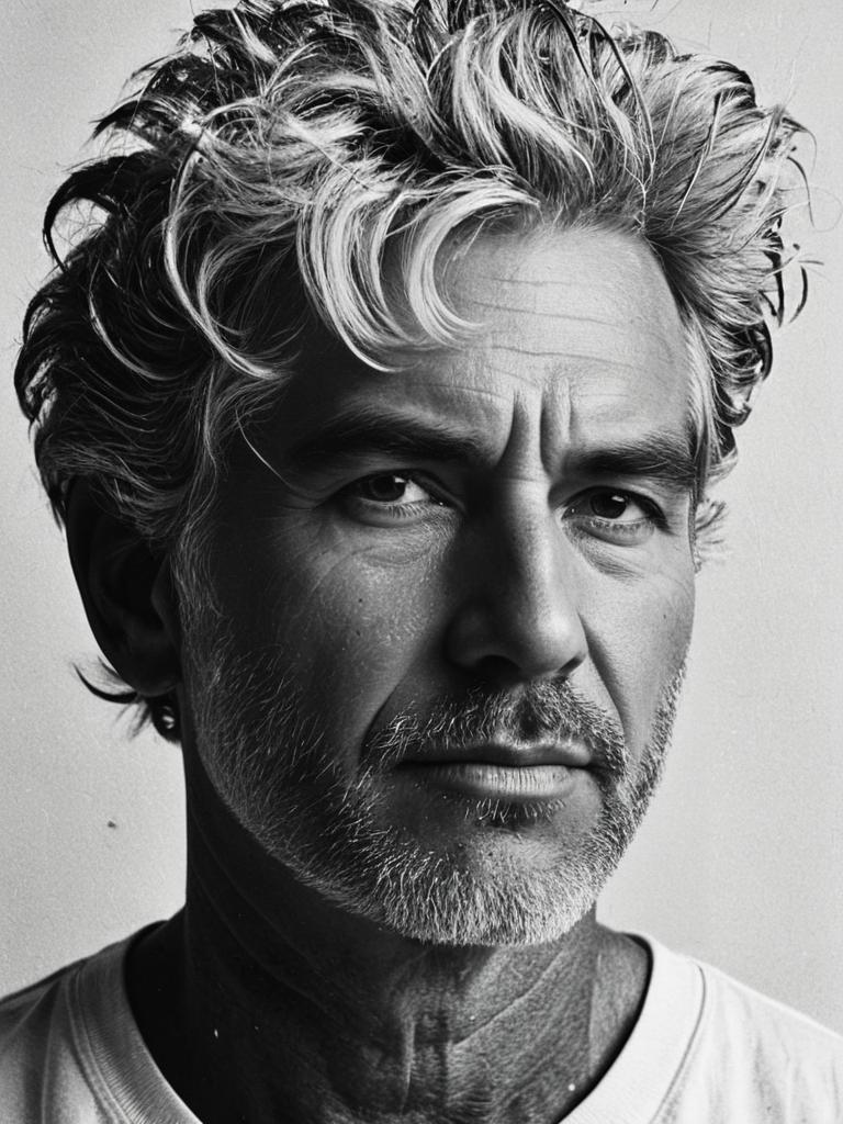 Man with Salt and Pepper Hair, black-and-white photorealistic editorial portrait