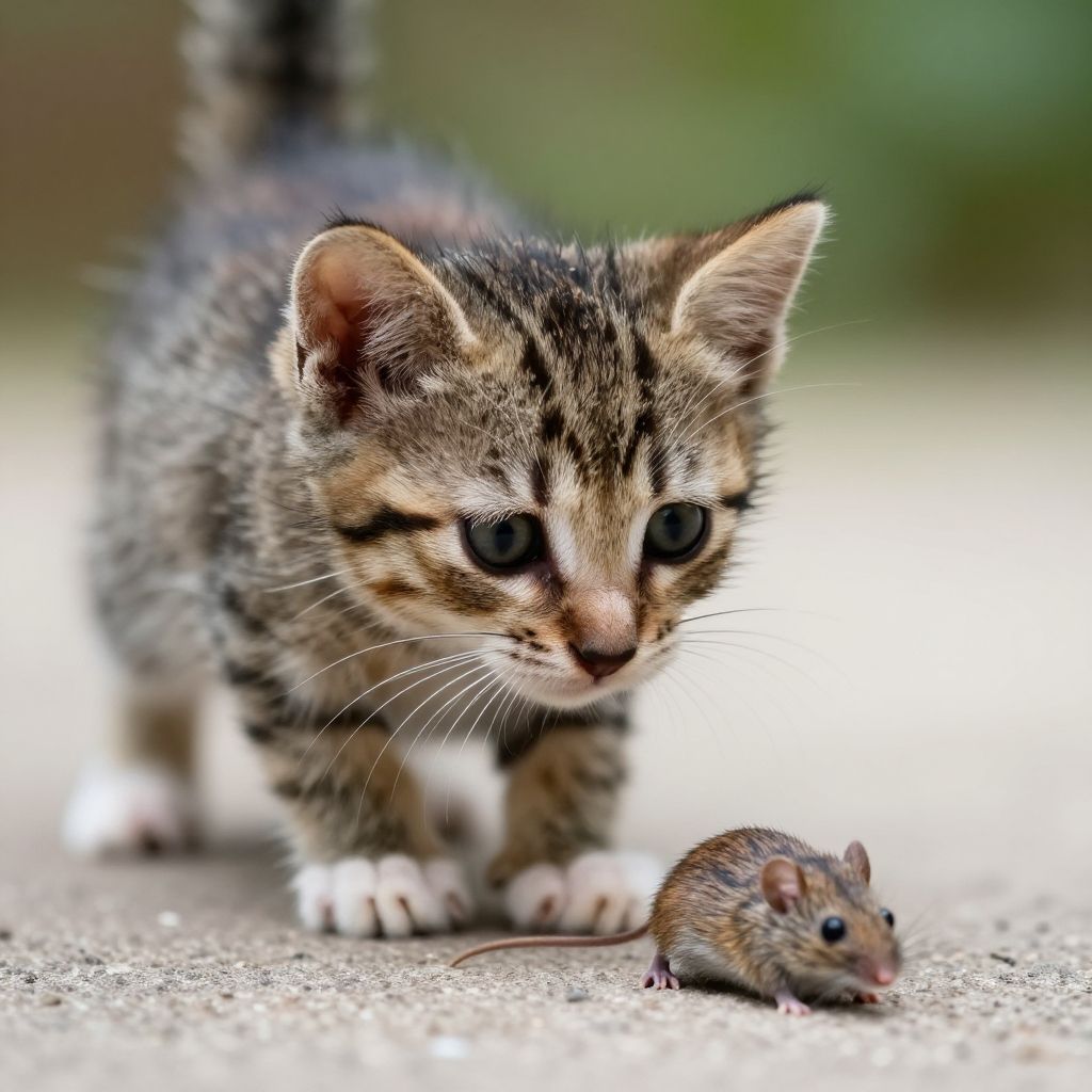 Photograph of a curious, striped tabby kitten with intense eyes, standing on a concrete path, staring at a small brown mouse.