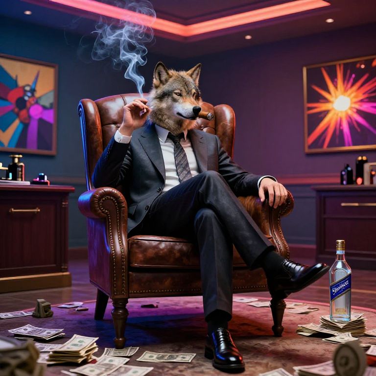 Surreal image of a man with a wolf's head seated in a large leather armchair in a stylish office with high ceilings and neon lighting. He is dressed in a polished dark suit with a tie, smoking a cigar with visible smoke, surrounded by scattered cash on the floor and furniture. The room features modern art paintings on the walls and a bottle of premium liquor on the floor, emphasizing a lavish and powerful atmosphere.