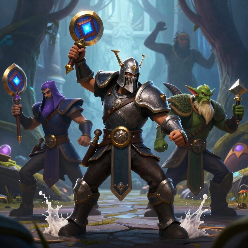 Realistic photo.A splash art for a Hearthstone championship, featuring a warrior, mage, and rogue in action poses, set against enchanted forests, in a whimsical and vibrant style, dynamic and exciting realistic photo