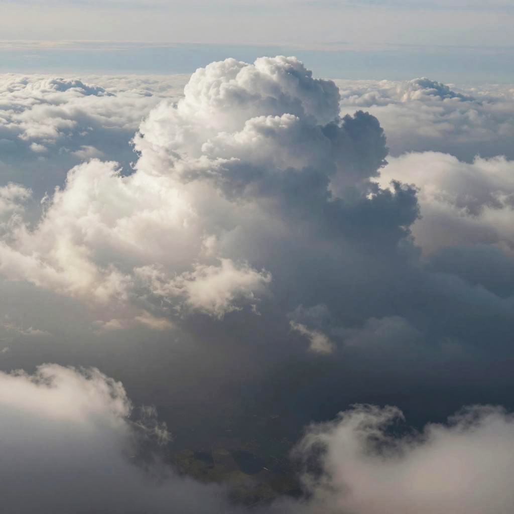 Photorealistic image of towering cumulus clouds viewed from above, showcasing intricate details and textures in soft daylight. The scene highlights dense, fluffy cloud formations rising above a layer of thinner clouds with subtle shadows and light contrasts, captured with sharp focus in ultra high definition.