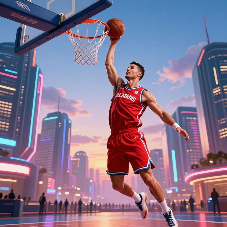 Ronaldo dunking a basketball in a futuristic cityscape, dynamic motion, vibrant colors, high detail, sports action scene, intense athleticism, dusk lighting with glowing neon lights, cinematic sports photography style.