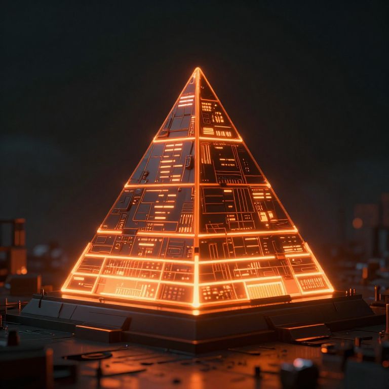 A cyberpunk-inspired 3D render depicts a luminous, tiered pyramid structure glowing with neon orange lights against a dark, atmospheric backdrop, evoking a sense of otherworldly mystery and technological wonder.