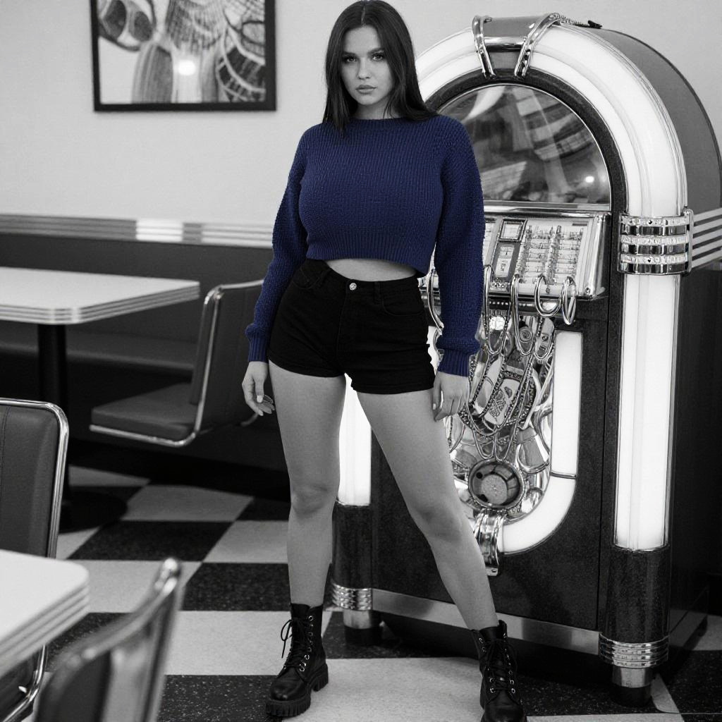 A Petite woman in casual streetwear, wearing a navy blue cropped pullover and black fitted shorts, paired with black combat boots, stands in a Diner with Jukebox, captured in the visual style of Ilford film stock. Sexy. Pretty face and beаutiful eyes. Big breasts