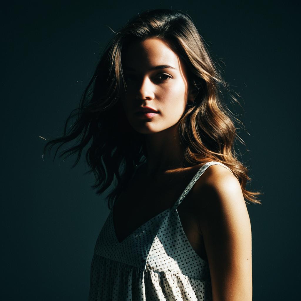 Long Layers hairstyle on fashion model, wearing silk jumpsuit, in photo studio, captured in fashion editorial style with soft sunlight.