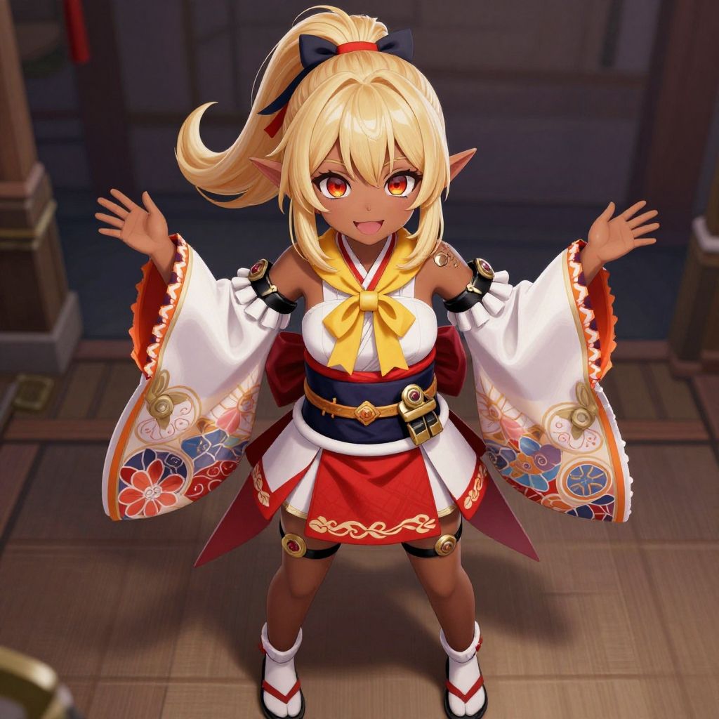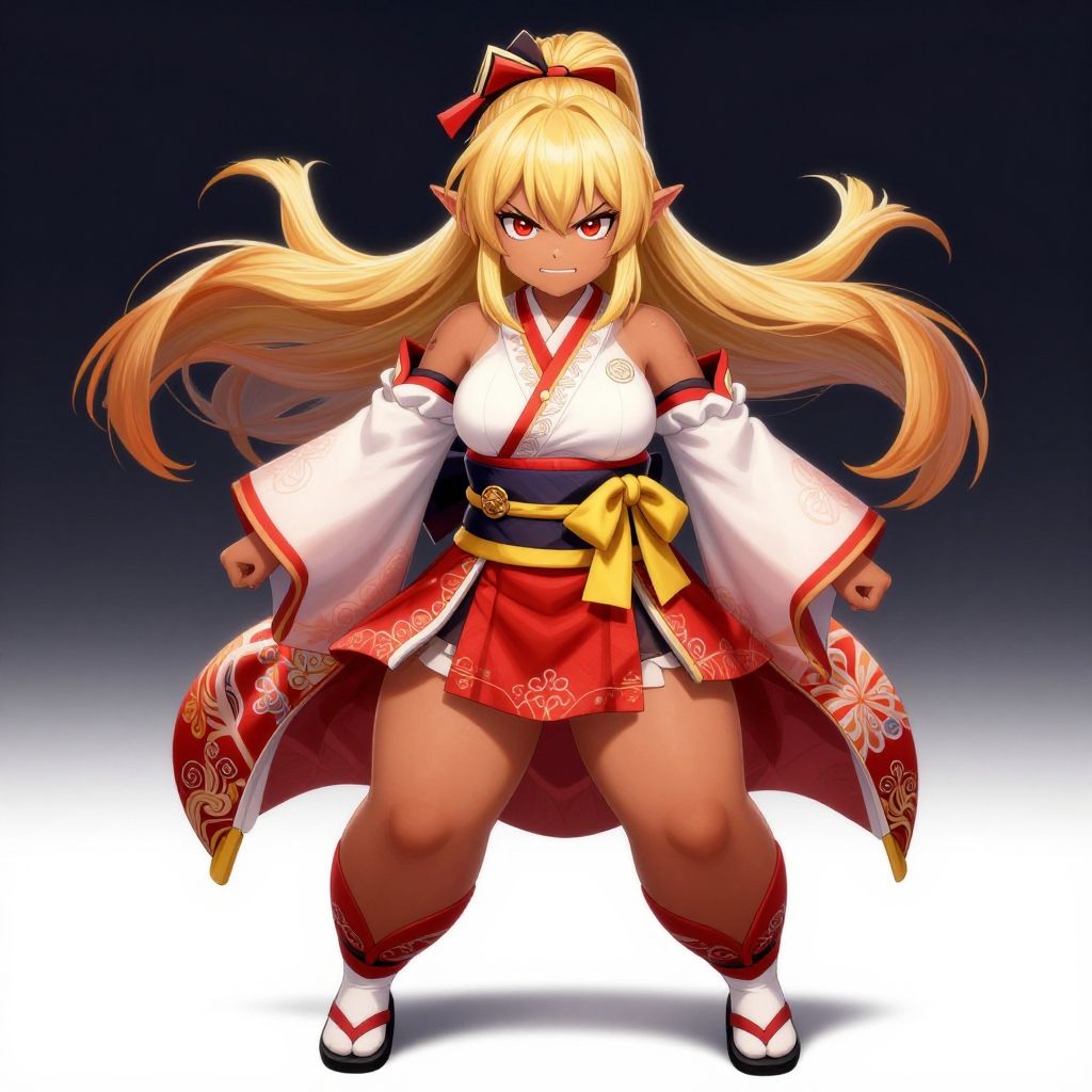 Chloe, 1girl, ponytail, red eyes, kimono, blonde hair, (ascot, bare shoulders, black footwear, detached sleeves, 'Spats', embellished costume, frills, japanese clothes, nontraditional miko, red skirt, Long Skirt, sandals, sarashi, skirt, socks, white sleeves, white socks, wide sleeves, yellow ascot, zouri, (Covered Body), Ponytail, hairband, (Small), sash, fully clothed, clothed, happy smile, brown skin, dark skin, pointy ears, elf ears, ribbon, bangs, dynamic pose, (masterpiece:1.1)intricate eyes, beautiful detailed eyes, symmetrical eyes, (dark-skinned female:1.2), narrow waist, wide hip, athletic body, inflated legs, thick thighs, (detailed face)), beautiful detailed lips, cute, (centered, scale to fit dimensions, Rule of thirds), (ultra detailed, extremely detailed), (photorealistic artwork:1.37), (extremely detailed CG unity 8k wallpaper), (((vibrant colors, vibrant theme))), (intricate), (masterpiece), (best quality)