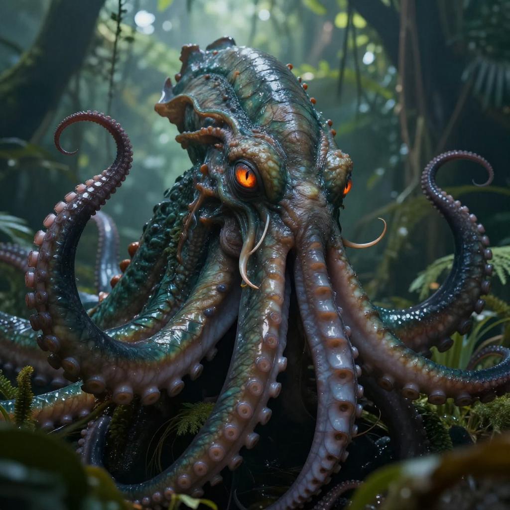 Close-up portrait of an ancient kraken with dark green, scaly tentacles and glowing orange eyes, set in a dense jungle environment with dramatic cinematic lighting. The creature’s detailed, mythical features are highlighted by soft, natural light filtering through jungle foliage, creating a mysterious and intense atmosphere.