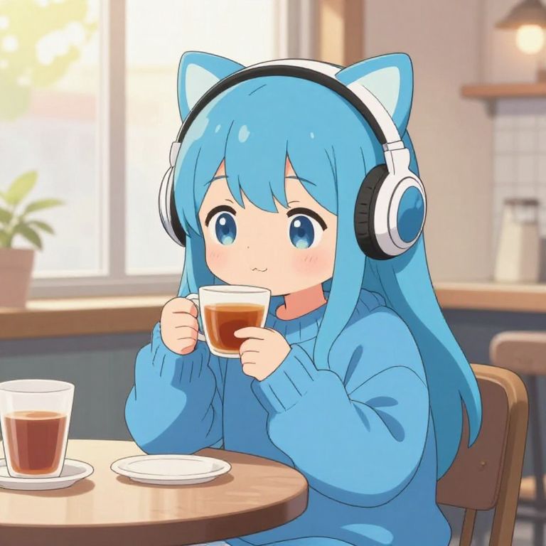 Cute blue cat anime girl in a cozy cafe setting, sipping tea with a tiny smile, wearing oversized sweater and cat ear headphones, warm sunlight streaming through window, soft pastel colors, anime illustration