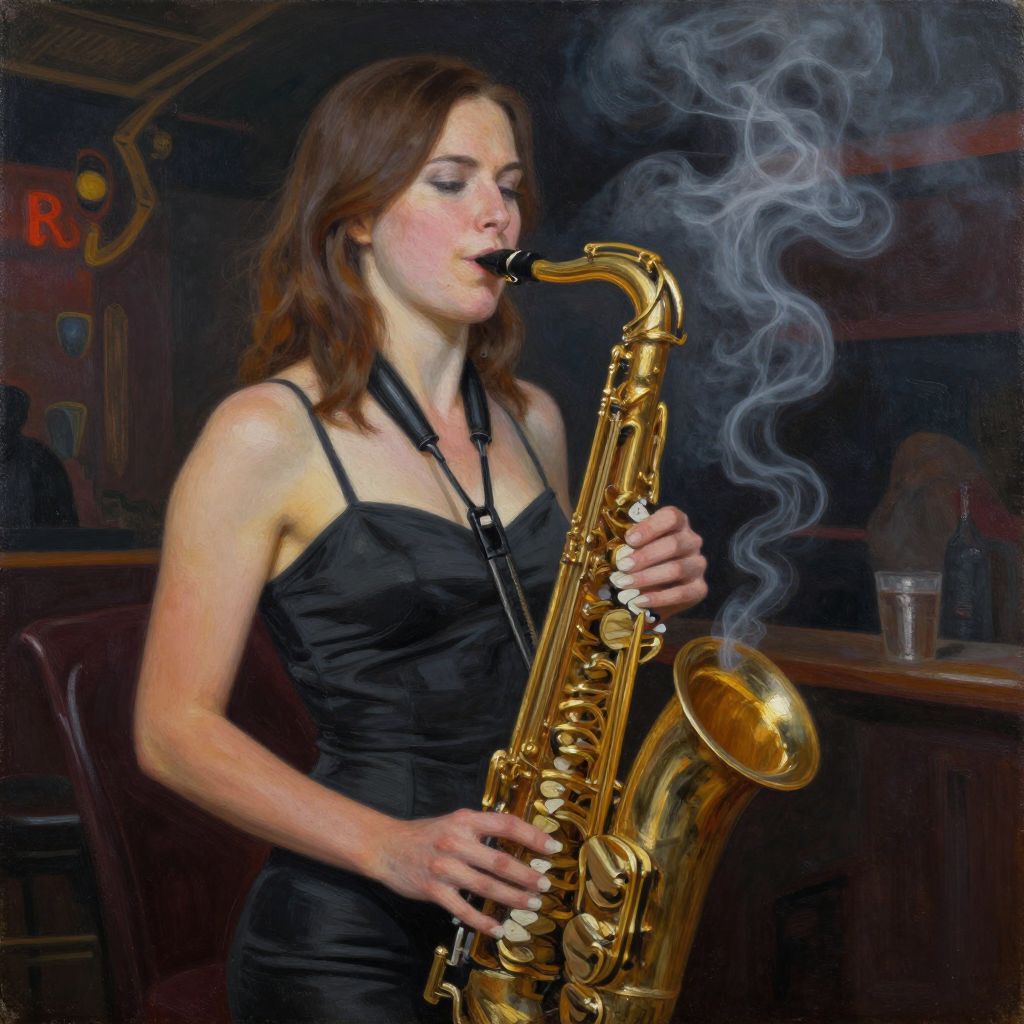 A surreal oil painting of a woman with saxophone-like features, set in a smoky club environment.