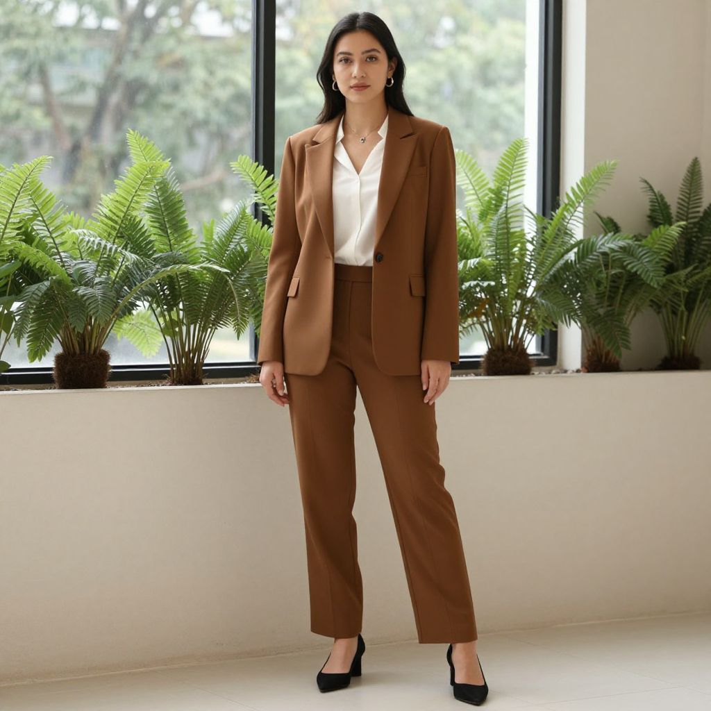 Smart Casual Work Wear Woman Costume, woman in brown suit standing in front of window with plant