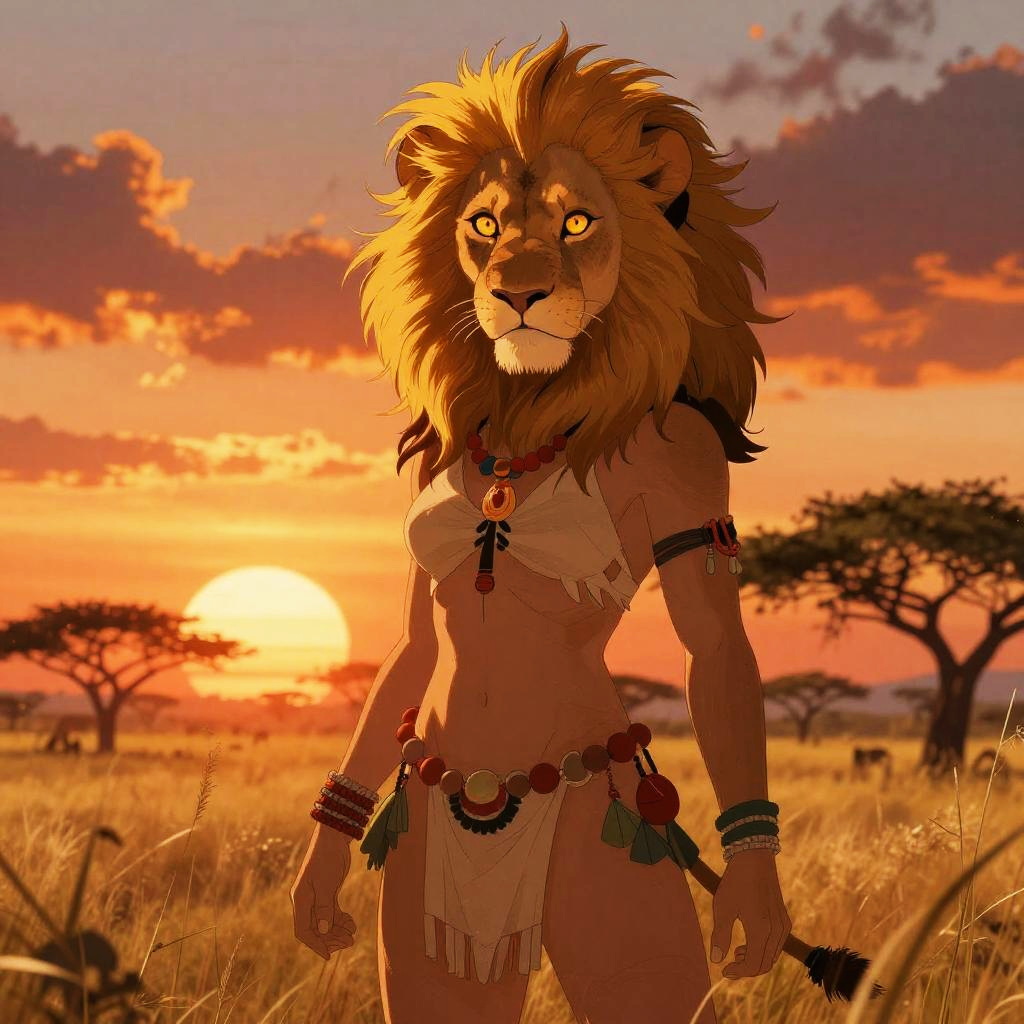 Digital artwork of an anthropomorphic lioness with a golden mane standing in a savannah at sunset, wearing tribal attire with red and green accessories, glowing
