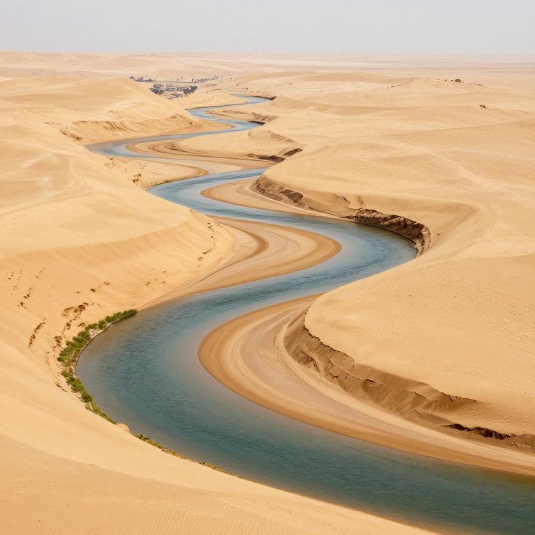An ethereal river carves a serpentine path through the golden sands, weaving a tale of resilience and mystery, where the whispers of ancient landscapes echo the quiet promise of renewal.