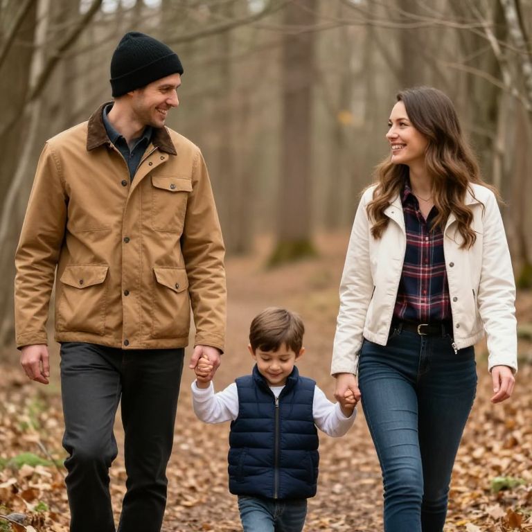 A warm photograph of a happy family of three walking hand-in-hand through a forest. The dad, wearing a tan jacket and black beanie, holds hands with the mom, who has long brown hair, a white jacket, and a plaid shirt. Their young son, in a blue vest and white shirt, is between them. The background is blurry with leafless trees and brown underbrush.