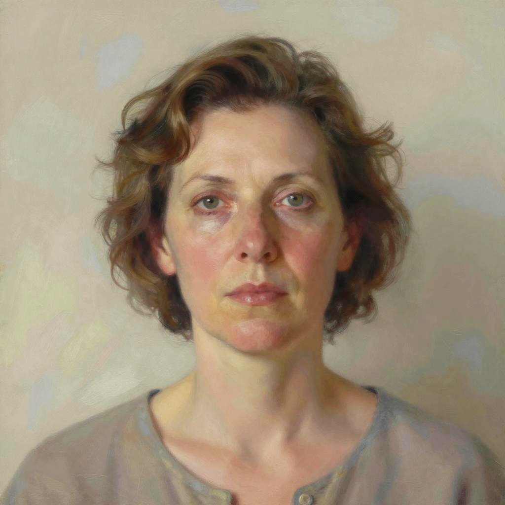 Realistic photo.Digital Design Create a portrait of a middle-aged woman, in the style of Georgia O'Keeffe, soft pastel colors, textured background, close-up composition. realistic photo