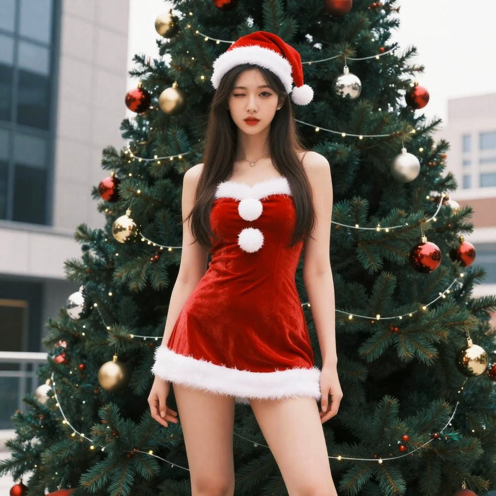Realism, Highres, Detailed, Extremely Detailed, indoors, solo, a girl posing, (standing), looking at viewer, wearing sntdrs, red santa dress, hyper detailed, high quality, epic realistic