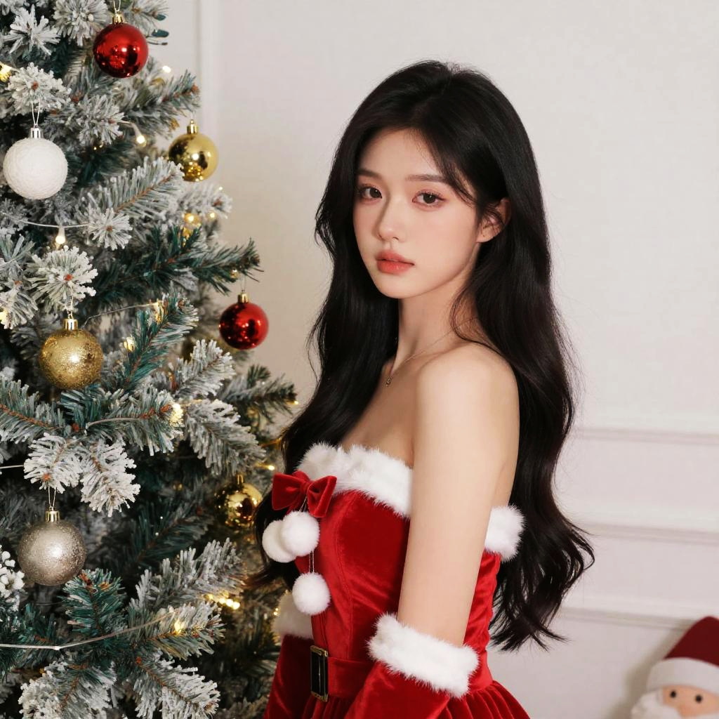 Photograph of an East Asian woman with long, straight black hair and bangs, wearing a red velvet, strapless Santa dress with white fur trim and a black belt with a gold buckle. She also wears a red Santa hat with white fur. She stands in a bright room with wooden floors, a beige armchair to the left, a potted plant on a wooden side table to the right, and a white wall behind her. Her expression is neutral, and she holds her hair with her right hand. The image has a soft, natural light.
