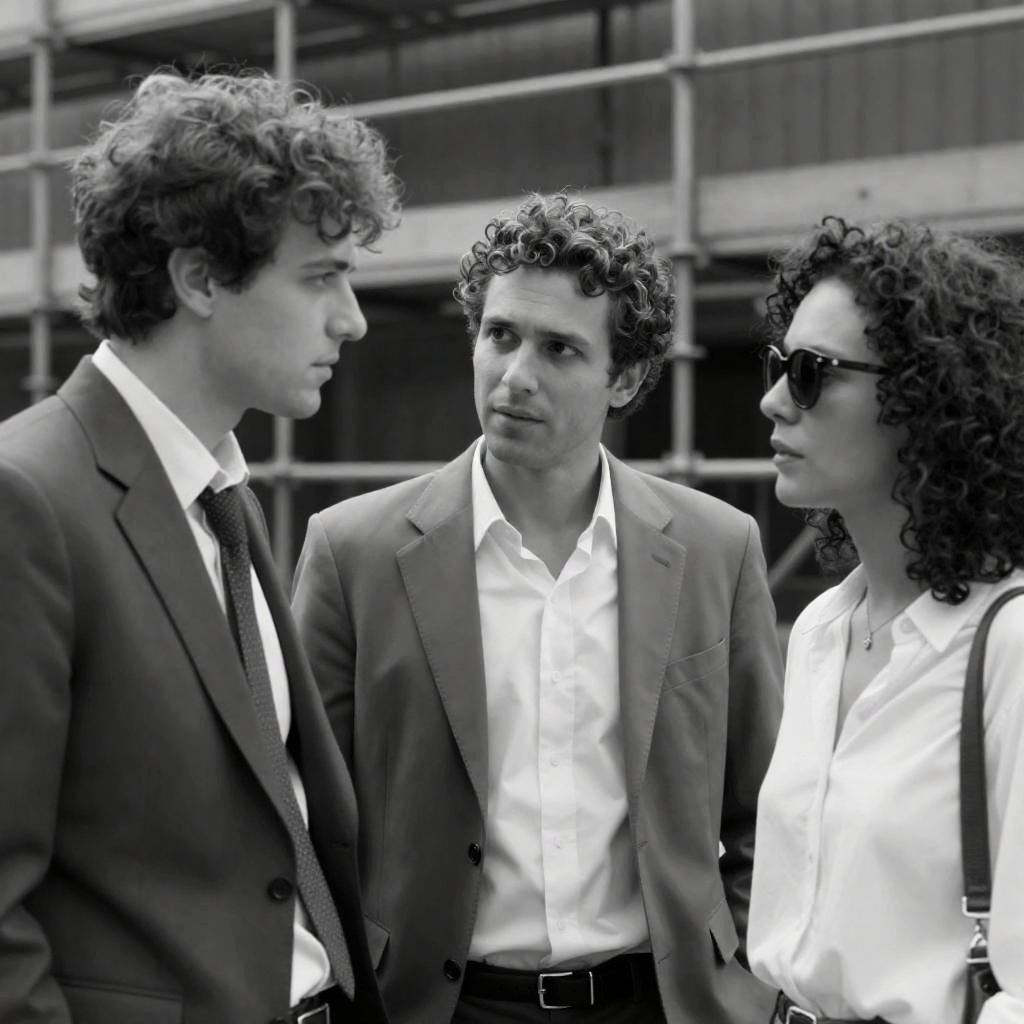 Black and white photograph of two men in a chase scene. The man on the left, with curly hair and a serious expression, is in a dark suit and white shirt, leaning forward with his right arm extended. The man on the right, with wavy hair and intense expression, is in a suit and tie, running with his arms raised. Background includes a door and abstract wall patterns. Both men are in mid-motion, emphasizing the urgency of the chase.