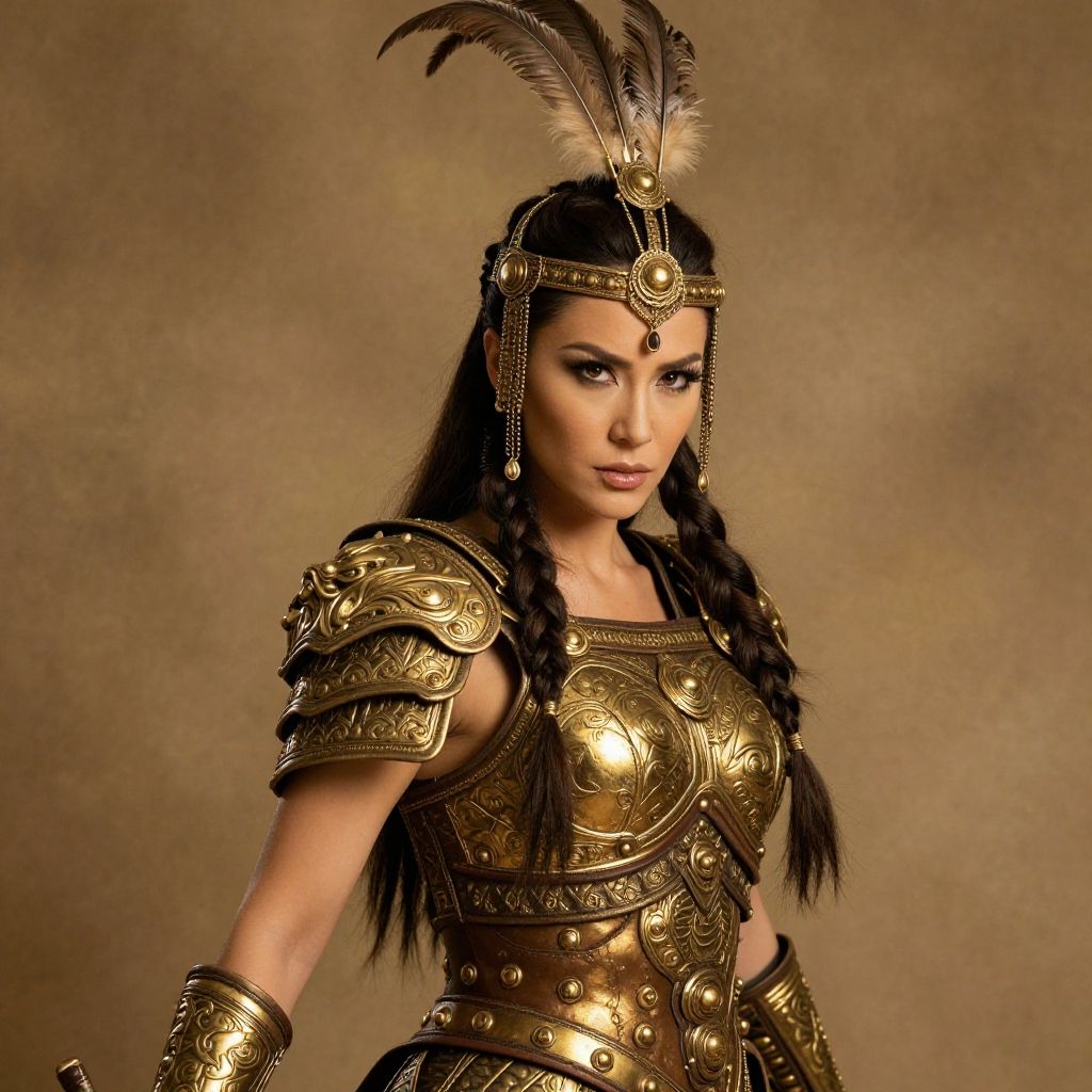 A fierce woman dressed as an ancient warrior adorned in detailed golden armor with intricate engravings and a headpiece featuring feathers. The image captures a strong, confident expression with braided hair against a warm, textured background, evoking a historical or fantasy theme.