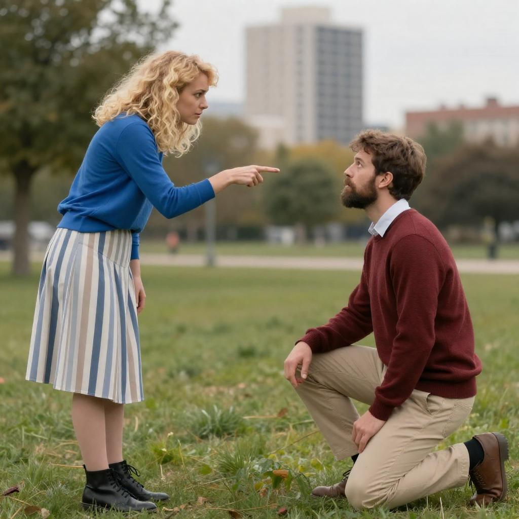 Photograph of a man and woman in a grassy field. Woman with curly blonde hair, blue long-sleeve shirt, and striped skirt points at man. Man with brown beard, red sweater, and beige pants kneels, facing her. Tree on left, tall building in background. Man looks up at woman, both have intense expressions.