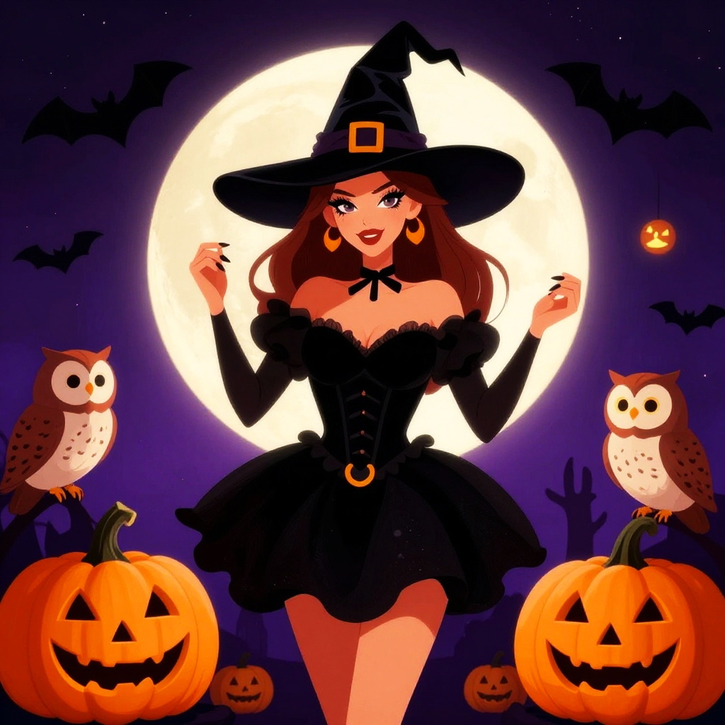 This vibrant illustration features a glamorous witch, adorned in a playful black dress and wide-brimmed hat, exuding a festive Halloween spirit. Surrounded by pumpkins, owls, and a moonlit backdrop, the artwork captures the essence of Halloween with its bold colors and charming details.
