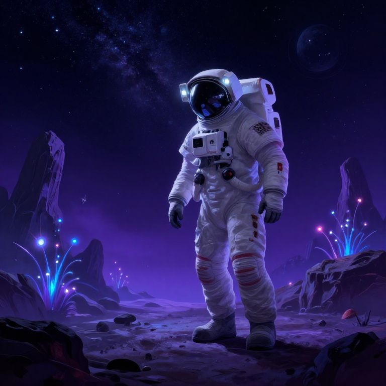 Digital artwork of a lone astronaut in a white spacesuit with a black visor, standing on a glowing, purple-hued alien landscape. Starry