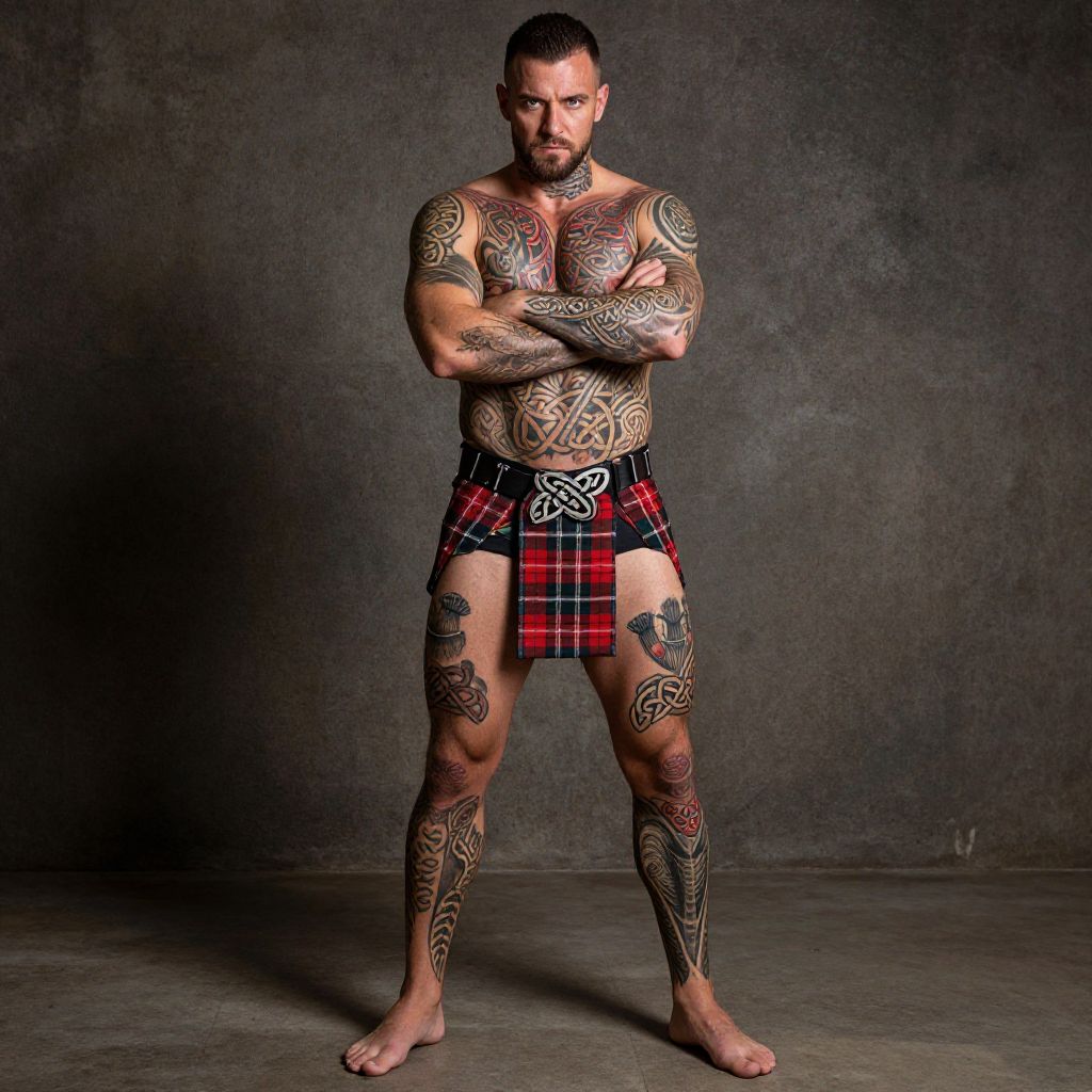 Full body shot of a ruggedly handsome man, standing proudly with his arms crossed, showcasing intricate Scottish tattoo designs on his torso, arms, legs, and back. Traditional Celtic knots, thistles, and tartan patterns adorn his skin, exuding cultural heritage and pride. Highly detailed, vibrant colors pop against his rugged complexion, set against a rustic Man has masculine face and piercing eyes