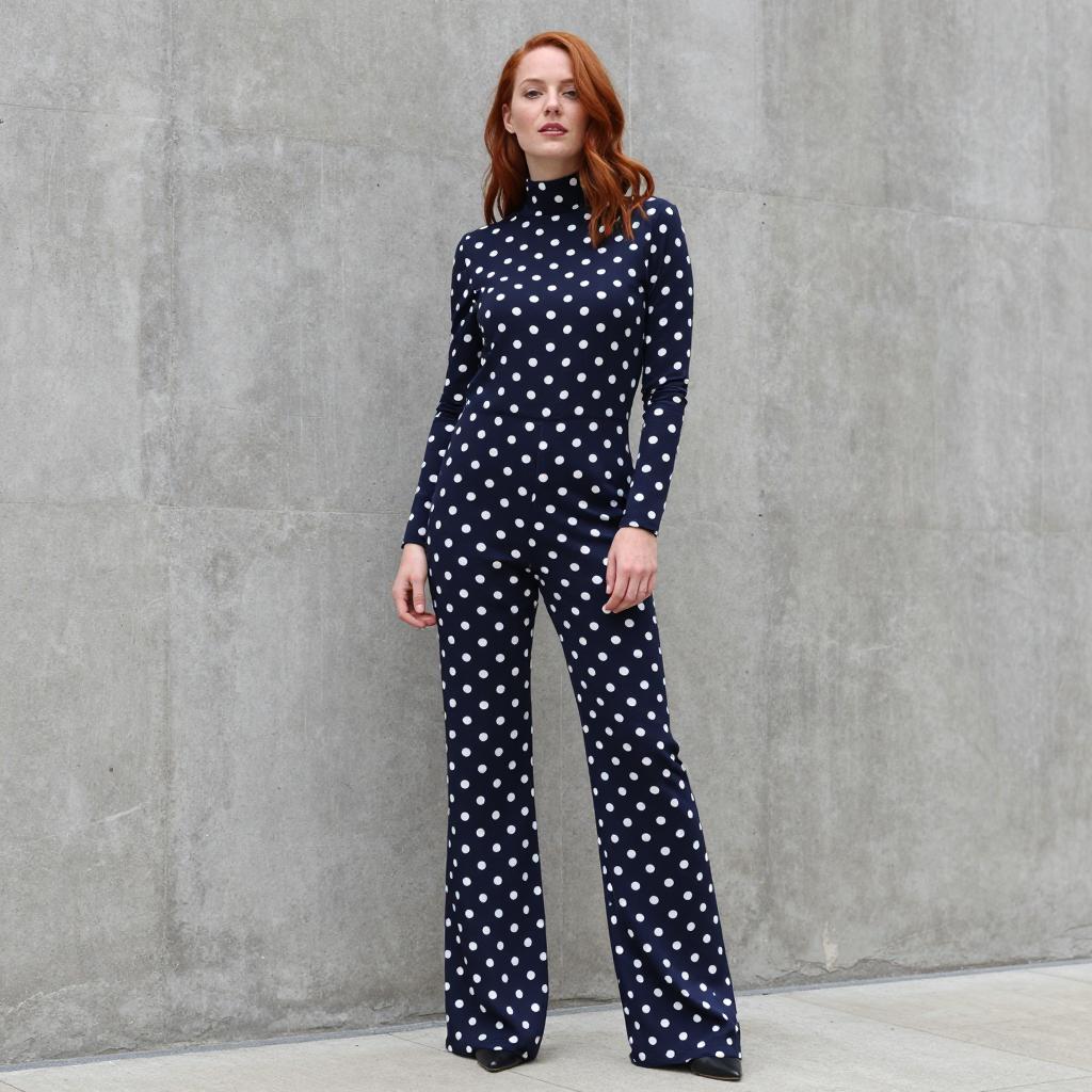Full-body photograph of a red-haired woman wearing a navy blue, long-sleeve, high-neck jumpsuit with white polka dots. She stands casually against a gray concrete wall in an urban setting, featuring a neutral expression and daytime lighting. The outfit is modern and fashionable, complemented by black pointed shoes.