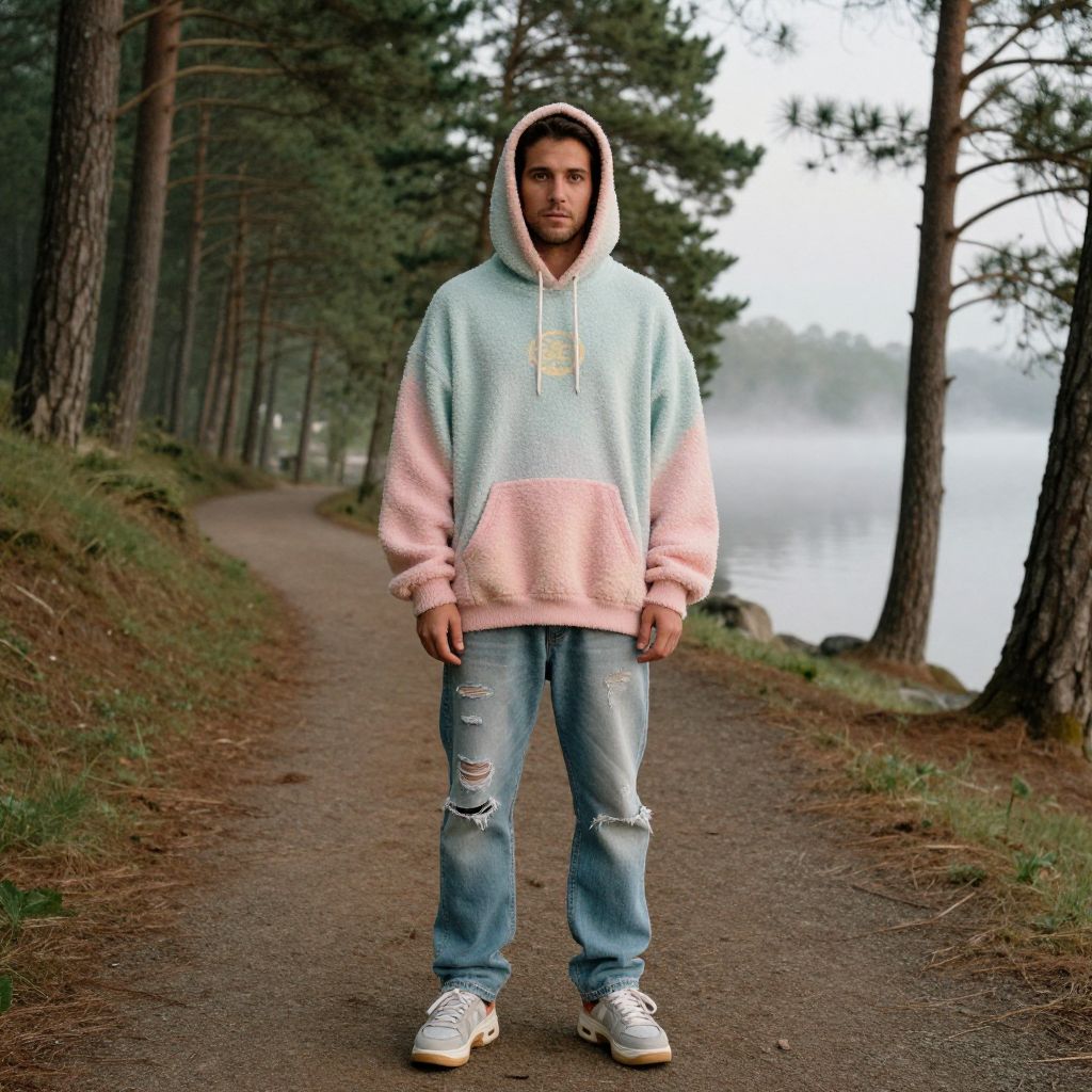 A man, oversized graphic hoodie in pastel tones, distressed light-wash jeans, chunky skate sneakers, cozy fleece fabric, laid-back aesthetic, serene lakeside trail, misty morning fog, towering pine trees lining the path, vintage photo style, relaxed expression.Man has masculine face and piercing eyes
