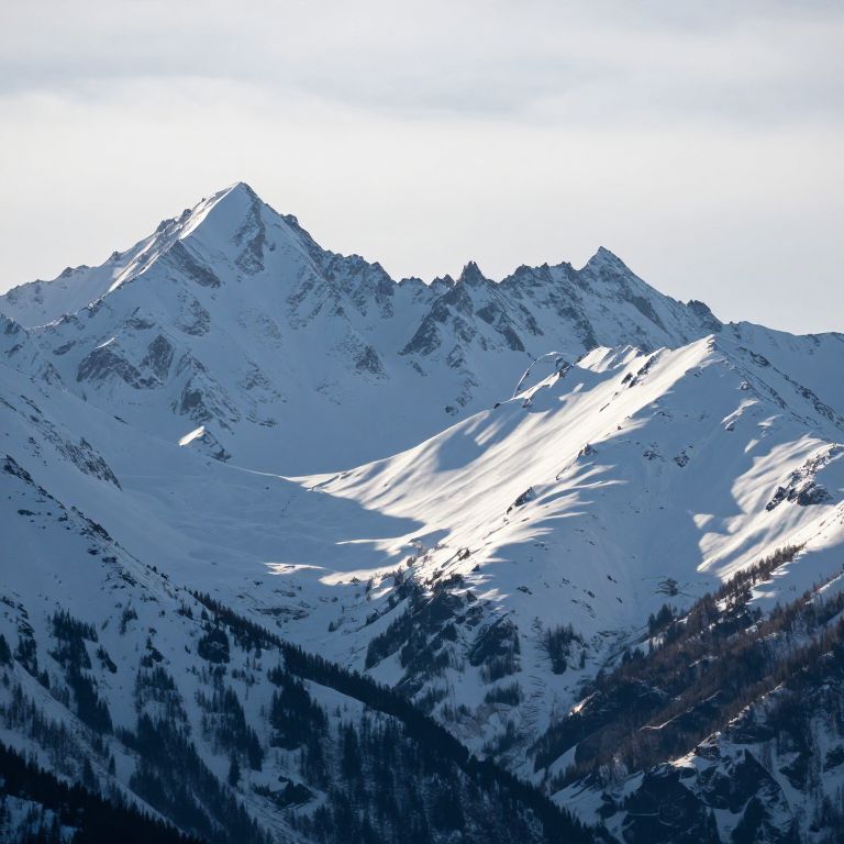 Snow-covered peaks rise majestically against a pale sky, their jagged silhouettes casting intricate shadows as sunlight dances across their pristine surfaces.