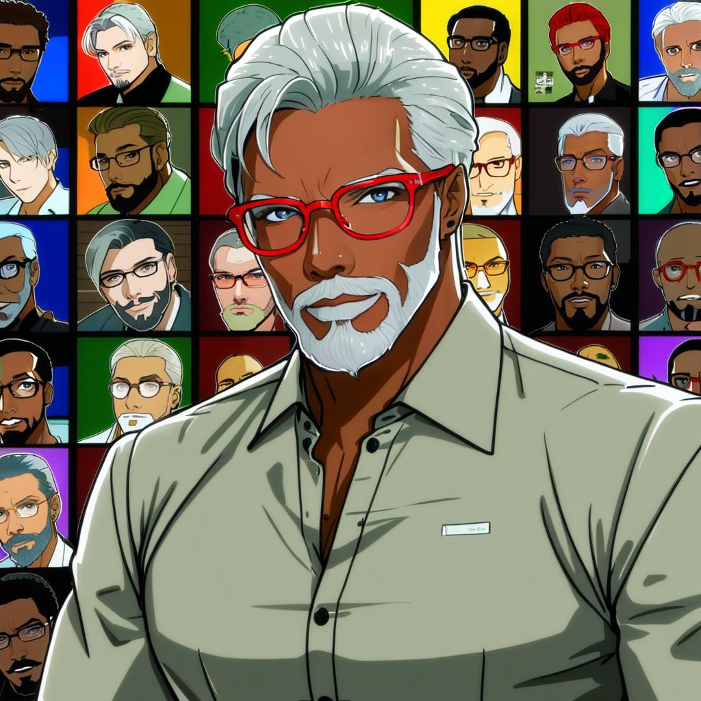 Arurandeisu, holostars, 1boy, mature male, beard, green eyes, grey eyes, glasses, red-framed eyewear, grey hair, short hair, white hair, collared shirt, virtual youtuber, virtual youtuber, goatee, by artist gibun (sozoshu), anime