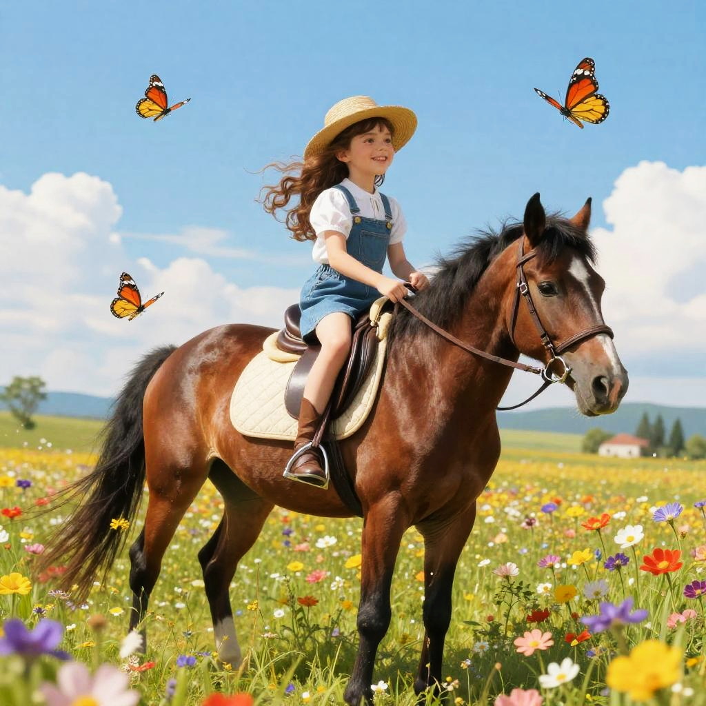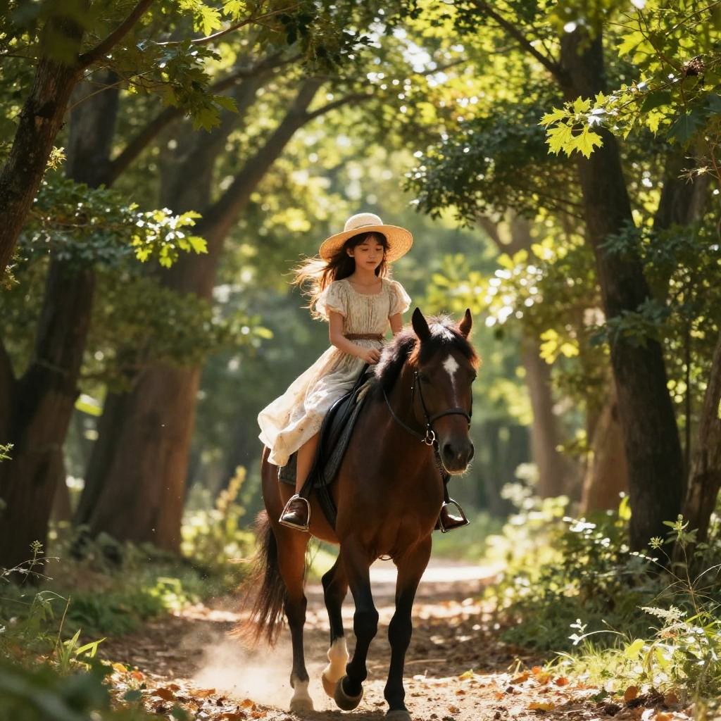 Young girl riding horse through a sunlit forest trail, wearing a flowing dress and a wide-brimmed hat, with dappled sunlight filtering through green leaves, magical and serene atmosphere.
