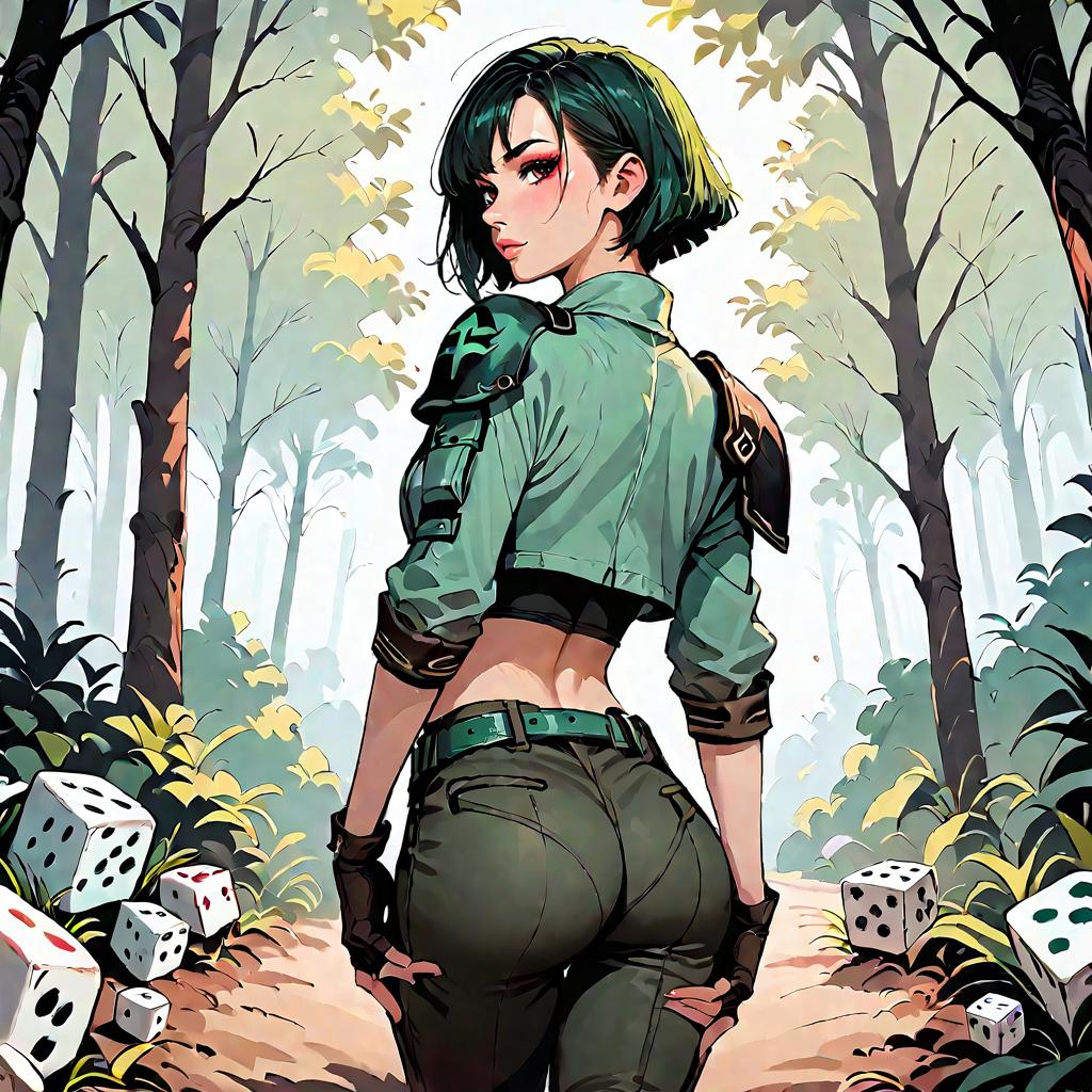 Score_9, score_8_up, score_7_up, score_6_up, source_anime, 1girl, short hair, green jacket, cropped jacket, single shoulder pad, bodice, cleavage, green belt, black pants, green boots, fingerless gloves, from behind, looking at viewer, looking back, ass, dirt road, forest
