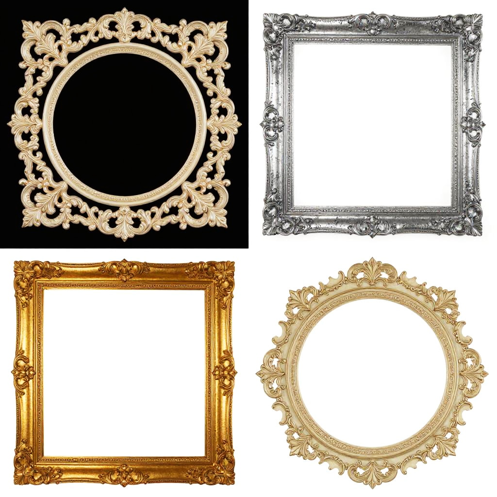 This image is a digital collage of four ornate, vintage-style frame designs. The top left frame is cream-colored with intricate, swirling patterns against a black background. The top right is silver with a distressed, textured look on a white background. The bottom left is gold with a more solid, rectangular frame. The bottom right is cream with a circular, floral pattern on a white background. The overall style is decorative and antique.