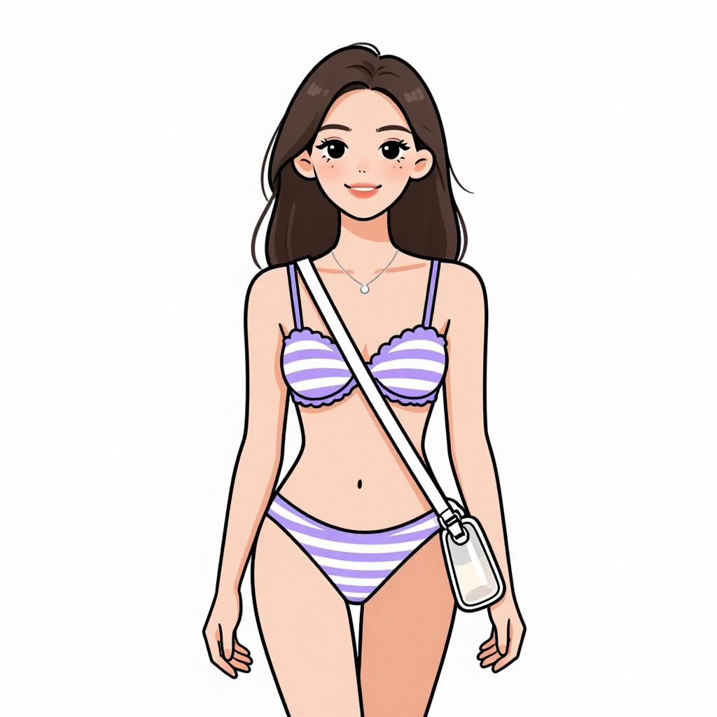 Digital drawing of a smiling young woman with straight brown hair, wearing a blue floral bikini, standing against a white background.