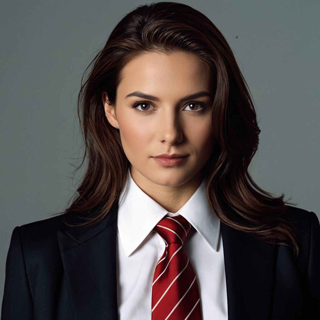 Portrait of a confident young Caucasian woman with short brown hair wearing a formal grey suit, white shirt, and striped necktie. She is looking directly at the viewer against a plain grey background, exuding professionalism and poise.