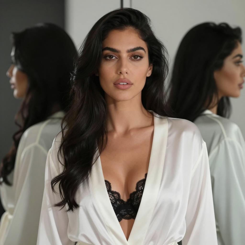 Photograph of a woman with dark bob haircut, wearing a gold and black headdress with feathers, and a gold bikini top. Two people in white shirts with black sleeves adjust her headdress. She holds a small bottle to her lips. Background includes pink curtains and an ornate gold frame. Intense focused expression on the woman. Two hands on her head. Gold jewelry and makeup accentuate her face.