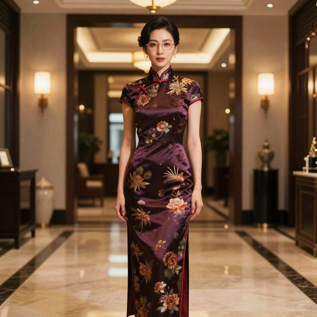 Photograph of an Asian woman in a dark purple floral cheongsam, standing in a luxurious, warmly lit hallway.