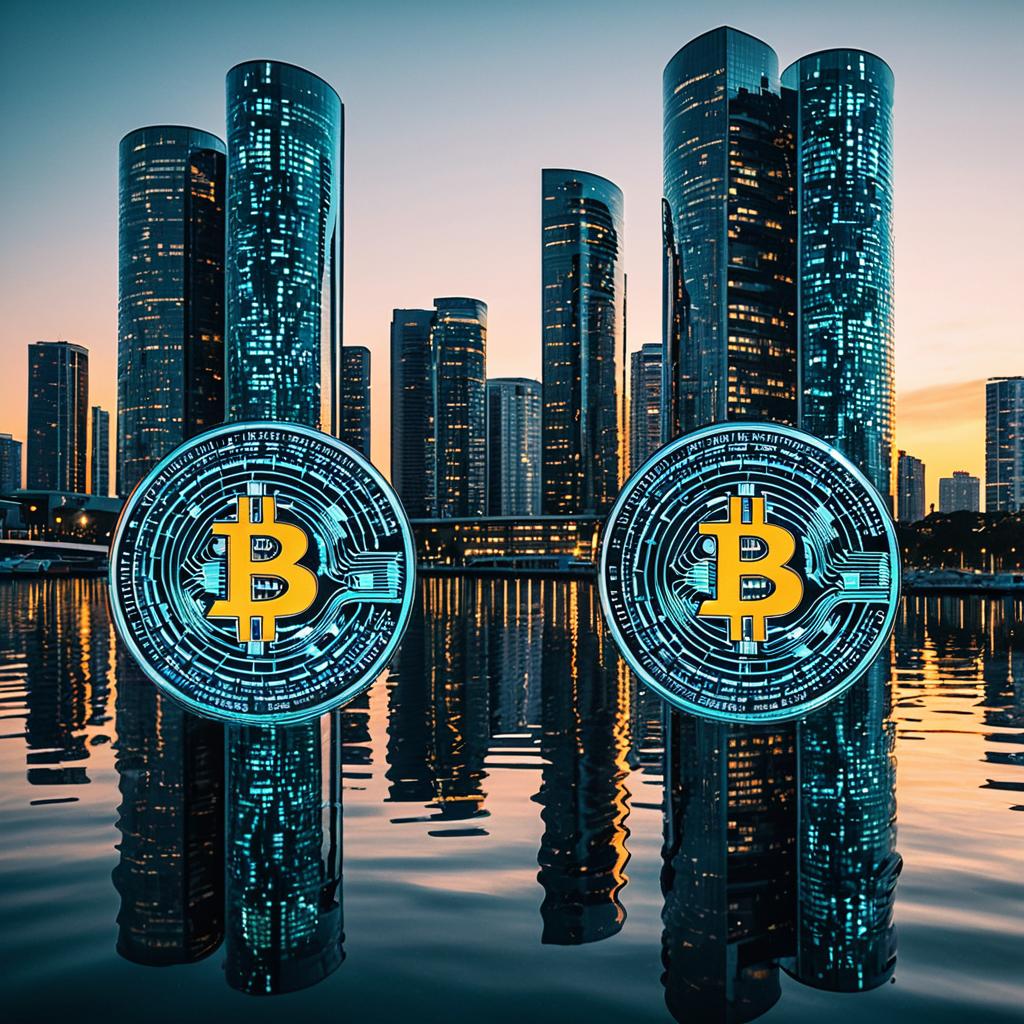 Digital artwork depicting bitcoin logos reimagined as futuristic spiral glass towers with cascading light grids. The composition features a high-tech waterfront city at dusk, with vibrant reflections of the illuminated towers and buildings on the water surface, creating a dynamic and modern atmosphere.